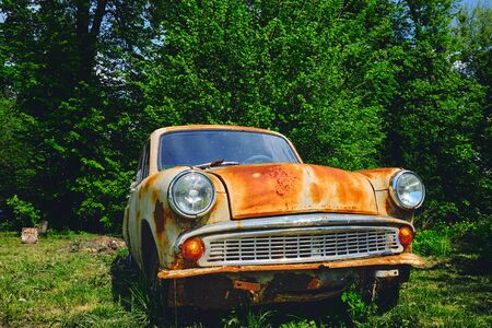 Old wrecked car in vintage style. Abandoned rusty yellow car in the forest. Closeup front view headlights of rusty wrecked abandoned car on blurred green tree background . Art of abandoned used car.