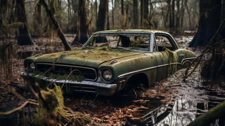 an old yellow car parked in the swamp, captured in the style of textural portraits. the dark green and brown surroundings create a visually striking contrast. this 32k uhd photograph showcases the influence of the dusseldorf school of photography, capturing the beauty of decaying landscapes. the classic american car adds an eerily realistic touch to the scene. ai generated