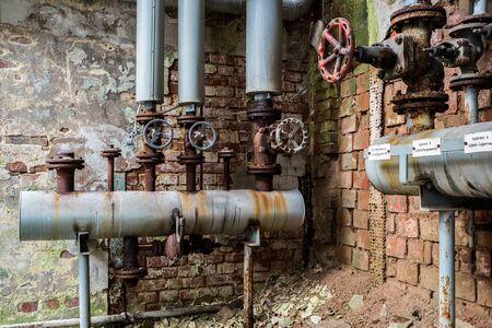 Old rusty Industrial tanks connected by pipes connected with valves in abandoned chemical factory