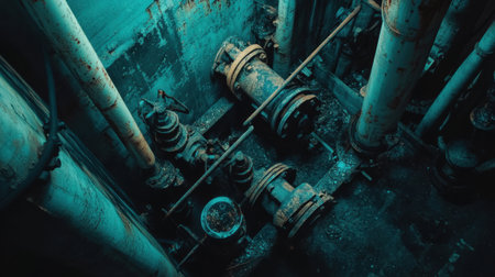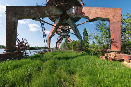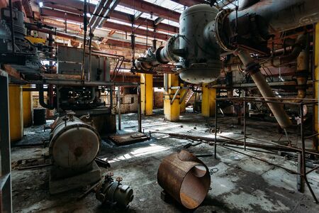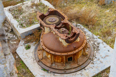 Old rusty metal mechanisms at an abandoned hydroelectric power plant. Apocalyptic background with copy space for text.