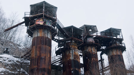 Liban Quarry - A historic site where prisoners were kept during Second World War. Old machines and piping equipment. Light snow-fall. High quality photo