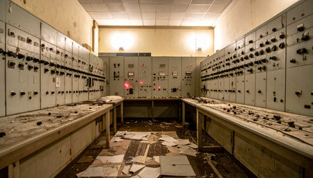Inside an abandoned control room, vintage equipment sits silently among peeling walls covered in maps and notes. Dim lighting enhances the aura of neglect and lost innovation in this forgotten space.