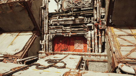 Large abandoned industrial hall. Dangerous area. Abandoned industrial interior with bright lights. Exclusion zone, radiation risk, lost city, apocalyptic building