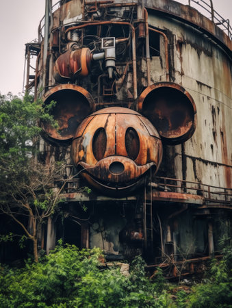Big abandoned industrial factory or plant with steel equipment, overgrown with plants, post apocalipse concept