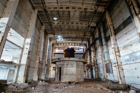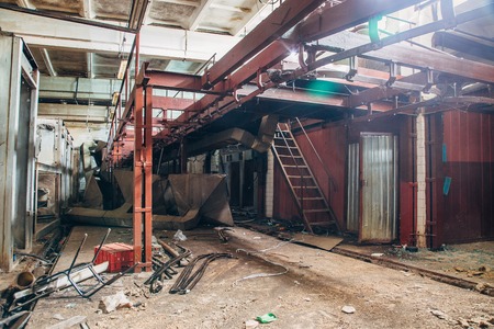 Old broken empty abandoned industrial building interior with remnant of equipment.