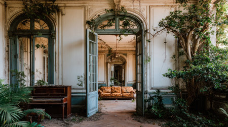 An open doorway reveals an interior with a piano and a sofa, framed by large arches and greenery. Soft light illuminates the scene, enhancing the textures of the stone and aged woodwork. This image evokes feelings of history and tranquility, suitable for various editorial and commercial applications.