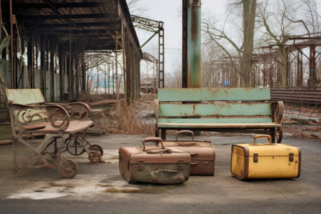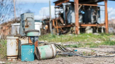 An image showcasing an abandoned industrial site with old cans and rusty equipment. The scene is set in a sunny environment with overgrown grass and decaying structures, highlighting neglect and urban decay.