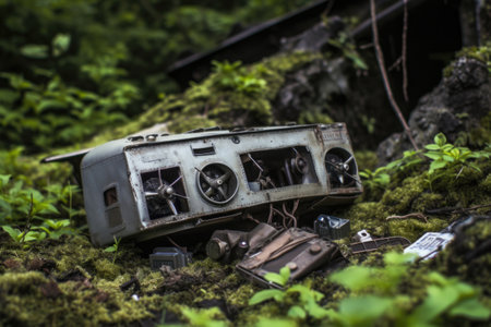 close-up of airplane wreckage with black box recorder, created with generative ai