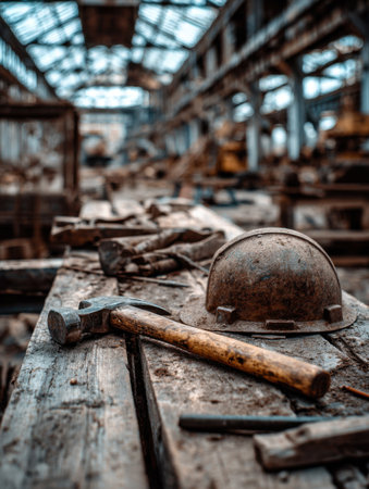 An abandoned factory reveals a cluttered workbench with a weathered hammer, a rusty helmet, and scattered tools, capturing the essence of industrial decay.