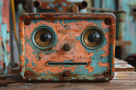 Close-up of a vintage, rusty machine with a blue and orange finish resembling a face.