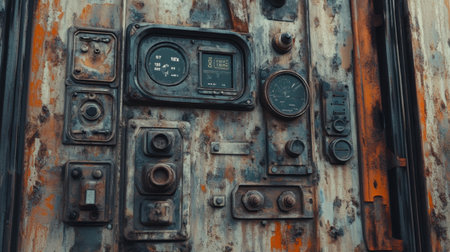 A close-up view of a vintage industrial panel showcasing various gauges, switches, and dials against a rustic metal background, perfect for design projects.
