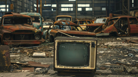 Old broken television in front of abandoned cars in a dilapidated warehouse