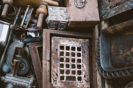 Abstract industrial background made of old machine parts, selective focus, color toning applied.