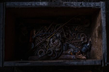 Pile of fasteners and screws close up. scrap metal. different metal parts