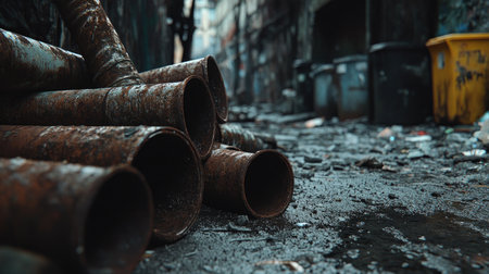 A view of a dark urban alley featuring rusty pipes scattered amidst debris and trash bins. The gritty environment reflects neglect and decay.