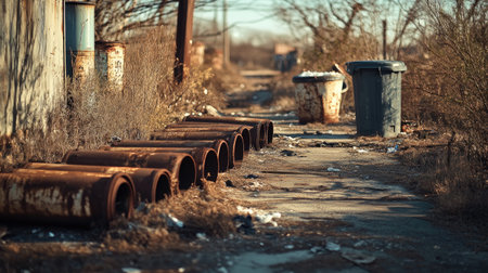 A captivating scene of an abandoned industrial area featuring rusty pipes and trash bins, overrun by wild vegetation, bathed in warm sunlight.