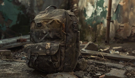 A backpack lies on the ground in the center of an abandoned building. The dimly lit space highlights the worn-out walls and debris scattered around the backpack.