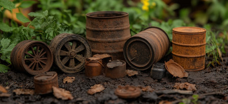 Rustic collection of worn out wheels and oil cans in a natural outdoor setting.