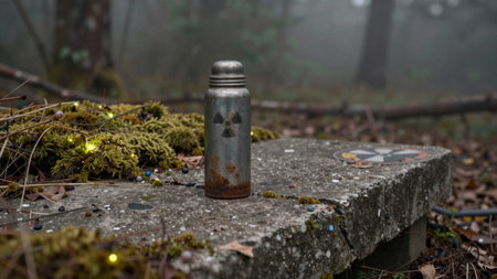 A weathered metal canister with a radiation symbol rests on an old stone, surrounded by lush moss and soft mist within a secluded forest. Nature and mystery blend in this enchanting scene.