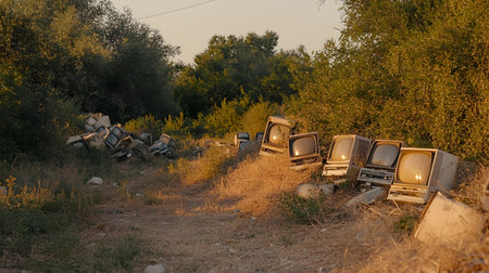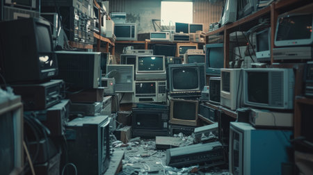 Electronic waste symbolized by a pile of old CRT monitors in an abandoned, dimly lit room.