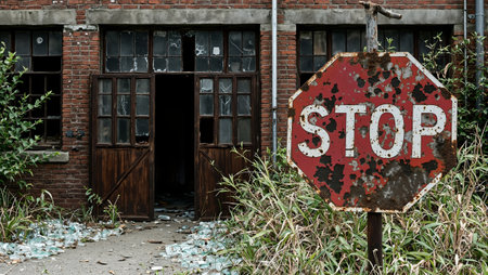 Rusty Stop sign at entrance of abandoned factory Wind bent pole overgrown weeds broken glass