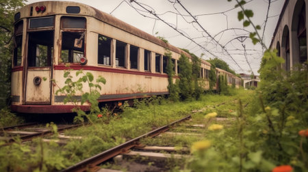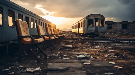 two broken down trains rest on a rocky shore, bathed in the warm glow of the sun. this captivating photo captures the essence of rusty debris and dystopian cityscapes, reminiscent of photography and atmospheric installations. the scene is filled with poignant details, including crowd scenes, all illuminated by soft and atmospheric lighting. ai generated