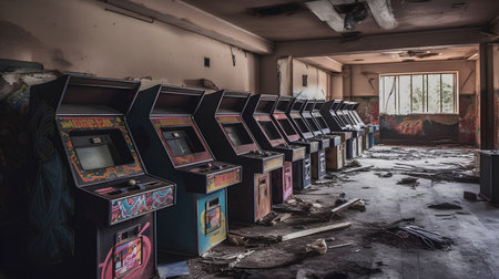 Abandoned arcade machine in an abandoned factory. Retro style.