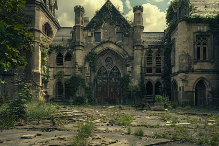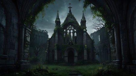 Ominous Abandoned gothic castle church. Ruin scary. Generate Ai