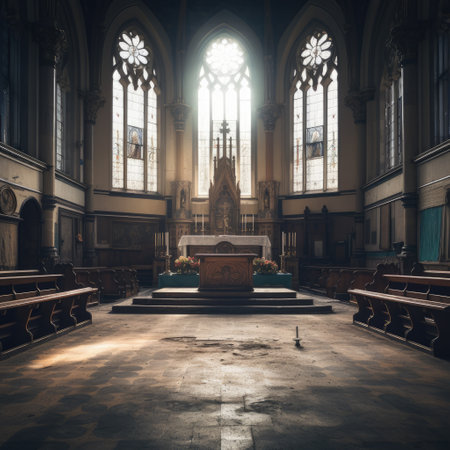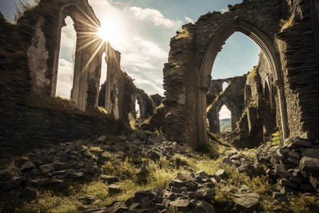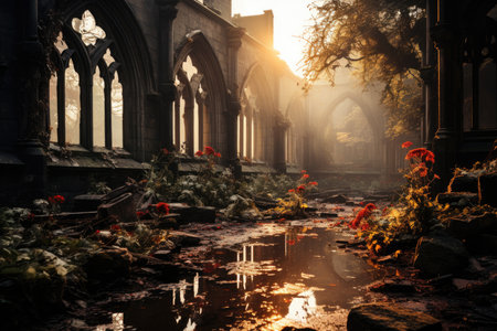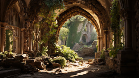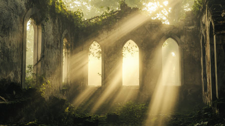 Sunlight pierces through the ruins of a once grand cathedral, casting a divine glow over its crumbling altar and sacred cross.. AI Generation