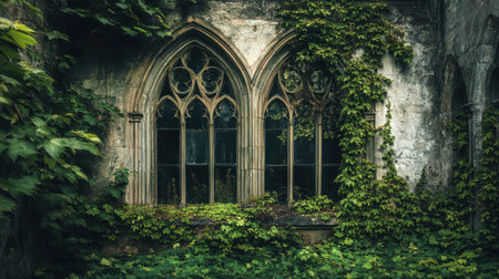 An ancient gothic window, intricately designed, is covered in vibrant green ivy. Sunlight filters through the leaves, showing the beauty of nature reclaiming the abandoned structure