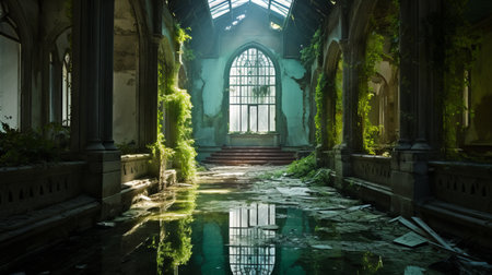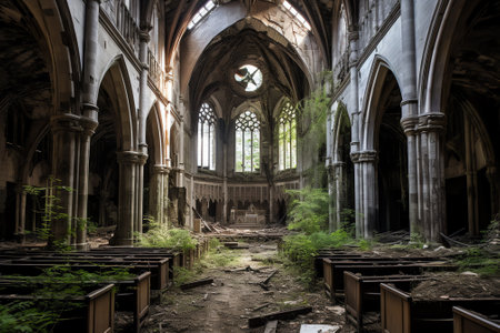 Eerie abandoned church with shattered stained glass and nature reclaiming the interior