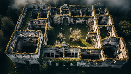 An aerial view of a large, decaying stone manor house with a central courtyard, overgrown with moss and trees, shrouded in mist.