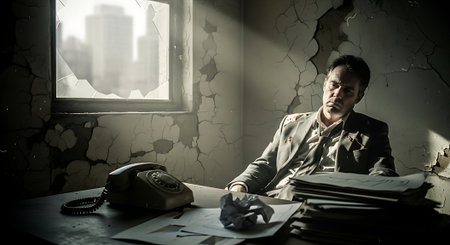An eerie abandoned office with shattered glass windows, dim lighting, and scattered papers, evoking a sense of desolation and forgotten work