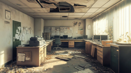 Abandoned Office Interior with Sunlight and Scattered Papers, Workplace Concept