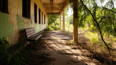An Abandoned building with overgrown vegetation and empty bench