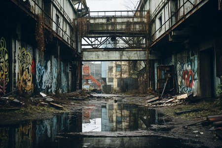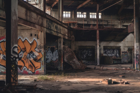 Evocative perspective of a decaying industrial hall with graffiti art and aged architecture, conveying a sense of abandonment and history.