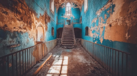 Rustic Abandoned Building Interior Staircase Blue Walls Old Architecture art ruin worn aged dark