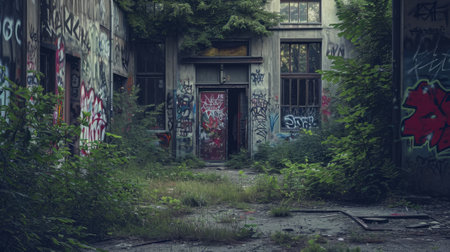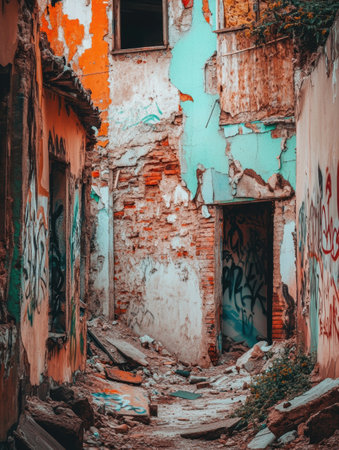 Crumbling buildings with cracked walls and vibrant graffiti reveal a forgotten urban space, enticing visitors to discover hidden stories of neglect.