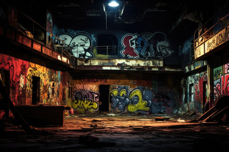 Abandoned factory building with many graffiti on the walls at night, A vivid haunting image of an abandoned nightclub. Dark, graffiti-covered walls frame the dimly lit space, AI Generated