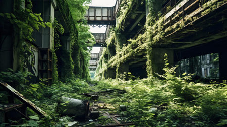 abandoned factory with broken windows and overgrown vegetation, in the urban landscape of modern city, created with generative ai