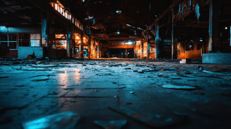 Explore the haunting beauty of an abandoned warehouse, where broken glass and dim lighting create an eerie atmosphere, evoking feelings of loss and neglect in this desolate space.