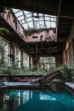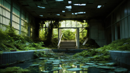 the photo captures a hauntingly beautiful scene of a ruined city, seen through the perspective of an abandoned hallway. the dark reflections add an eerie atmosphere to the detailed and atmospheric portraits. with its dark green tones and hazy ambiance, this japanese photography style creates a captivating image. it's no wonder this photo was a contest winner in the poolcore category. ai generated