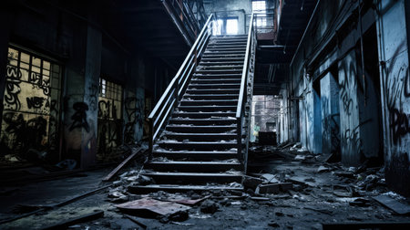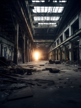 the remains of a destroyed industrial building, with broken windows and fallen parts, created with generative ai