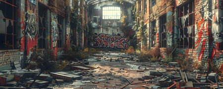 High-resolution photorealistic image of an abandoned industrial warehouse with graffiti on brick walls, overgrown plants, and scattered debris.