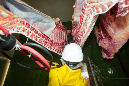 High angle first person view of a cattle brisket opening saw in action, slaughterhouse scene