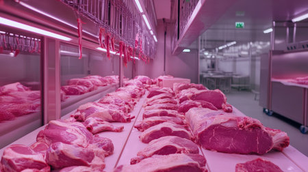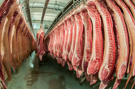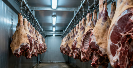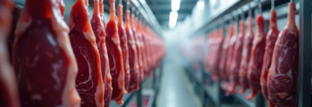 Rows of fresh meat hanging in a refrigerated processing plant, showcasing industrial food production