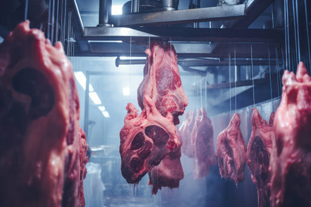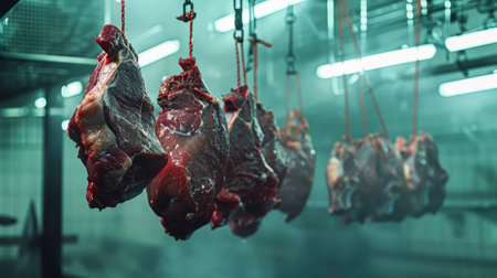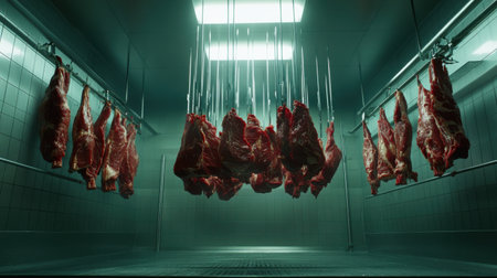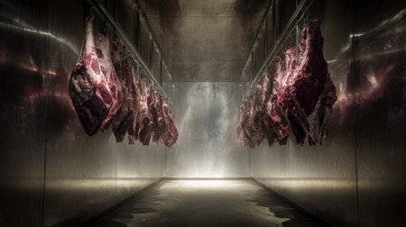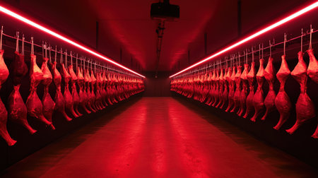 This striking image depicts raw meat hanging in an abattoir, illuminated by industrial lights, representing the meat processing industry and its practices.