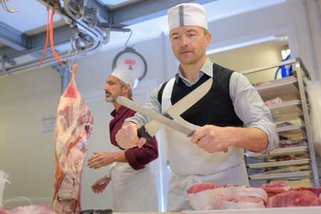 Processing fresh meat. Butcher with a axe in hand separating meat