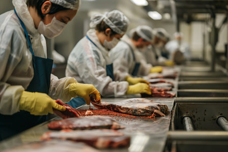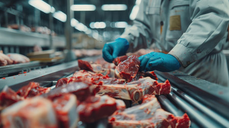 Butchers wearing protective clothing working with raw meat cuts on a conveyor belt in a meat processing plant