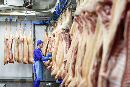 Slaughterhouse. Hands of the workers of the meat shop at work. Butcher cuts pork carcasses with a knife